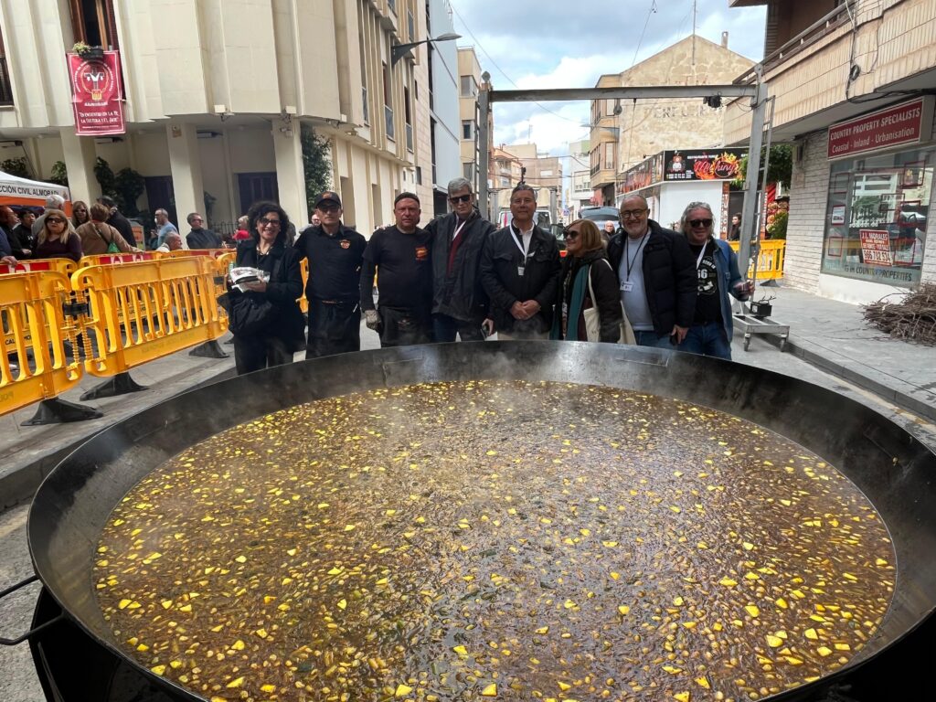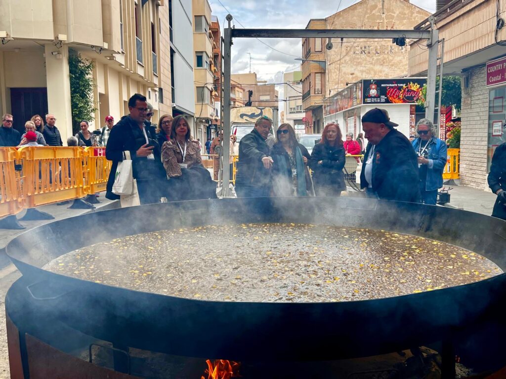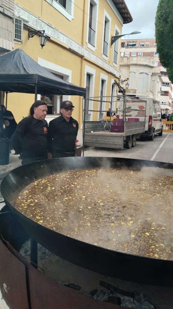 Se acerca la hora de comer, y sabemos que están cocinando dos arroces: uno para 800 comensales, y otro para unos 50. Los están haciendo a leña, y nos cuentan que no llevan ningún tipo de fondo sino que la base son las verduras y hortalizas: brócoli, ajos tiernos, habitas, patatas, garbanzos, pimiento verde, obviamente alcachofas, y calabacín, y están en el caldo un tiempo. Más tarde se le añadirá el pimiento rojo. Y como colofón, los boquerones, porque según nos han explicado los de Todo por la Paella y Paella Mediterránea, el boquerón contrarresta el sabor dulce que dejan las verduras y es típico en la Vega Baja. No lo sabíamos, así que, algo más que hemos aprendido.