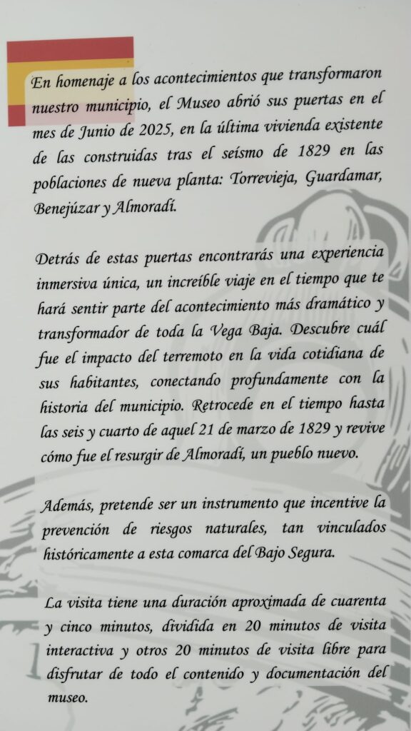 Se trata de un museo inmersivo, cuya visita dura 45 minutos y que te hace retroceder a la tarde del 21 de marzo de 1829, cuando se produjo el seísmo más destructivo de nuestra zona, y que se cebó con la Vega Baja. Aconsejan visitarlo en grupos de máximo 6 personas y la reserva se hace exclusivamente a través de la web.