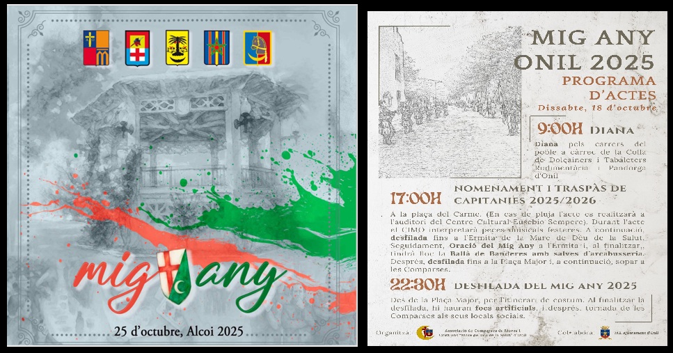 En el caso de Onil, el Mig Any se celebrará el sábado 18 de octubre con un programa de actos muy diverso. La jornada arrancará con la Diana a cargo de la Colla de Dolçainers i Tabaleters «Rudimentaria i Pandorga» d’Onil, por las calles de población. Entonces, la villa «cuna de las muñecas» con ésta «despertà» festera animará a todos/as los/as festeros/as a que comiencen a reunirse durante la mañana y a mediodía por el pueblo, para ir entrando en ambiente festero. Seguidamente, se celebrará la comida de hermandad de los distintos cargos festeros 2025/26, representantes de la Asociación de Comparsas de Moros y Cristianos «Virgen de la Salud» de Onil y autoridades locales. Tras este ágape empiezan los verdaderos actos festeros del Mig Any «colivenc«…