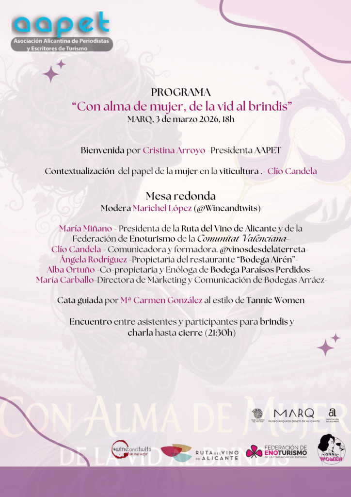 Bajo el título “Con alma de mujer: de la vid al brindis”, este evento propone una mirada femenina, profesional y contemporánea del sector vitivinícola, reuniendo a algunas de las voces más representativas del vino y el enoturismo de la Comunitat Valenciana y zonas cercanas.
