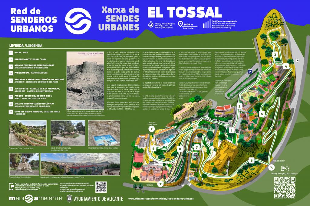 El desarrollo del Monte Tossal durante la última centuria es una oportunidad de adentrarse en una parte importante de la historia de Alicante y uno de los objetivos principales del sendero urbano diseñado por la concejalía de Medio Ambiente, que hace poco se estrenó y que cumple esta doble función de poner de relieve los enclaves y momentos destacados de su transformación en el gran pulmón verde que es hoy en el centro de la ciudad, al tiempo que ofrece la posibilidad de disfrutar de la naturaleza y del paisajismo que ofrecen sus privilegiadas vistas de Alicante y su bahía. Desde el pasado mes de diciembre de 2023, se puede recorrer este nuevo itinerario ambiental de la Red de Senderos Urbanos que recorren el Monte. El sendero, tiene un trazado de casi 3 kilómetros y cuenta con 9 puntos de parada o diferentes áreas. El itinerario se inicia en la rotonda del Tossal, donde se ubica el monumento a los Héroes de la Guerra de la Independencia para seguidamente, dar paso a las instalaciones del parque, que fue inaugurado en la primavera de 1995 y cuya morfología simulaba la Comunitat Valenciana, de ahí que se le denominara “temático”. El mismo continúa por las inmediaciones del parque introduciéndose en un área de itinerarios diferenciados que siguen unos criterios que indican la dificultad o desnivel de los diferentes recorridos. En esta zona hubo un antiguo manantial llamado “Fuente Santa” que durante varios siglos abasteció de agua a la ciudad. En su tránsito por la ladera este del monte, el sendero llega a una zona con panorámicas que sirven para realizar una interpretación ambiental del paisaje. El camino continúa por unas sendas sombreadas por pinos, moreras y ficus, hasta llegar a la confluencia de la calle Ronda del Castillo para iniciar un pequeño ascenso y bordear la fortaleza del Castillo de San Fernando. Posteriormente, llegamos a uno de sus puntos o paradas destacadas en el parque donde se encuentra el busto del Doctor Rico, en reconocimiento a este médico alicantino que en 1911 tal y como hemos apuntado anteriormente, propuso con éxito al Consistorio adquirir el Tossal de San Fernando para repoblarlo con pinos y convertirlo en una zona verde y lugar de esparcimiento para la población. El mismo enlaza por la zona suroeste del monte para introducirse en un área propicia para la interpretación que en parte, permite entender la historia geológica de Alicante.