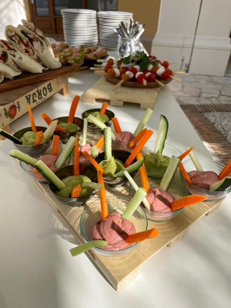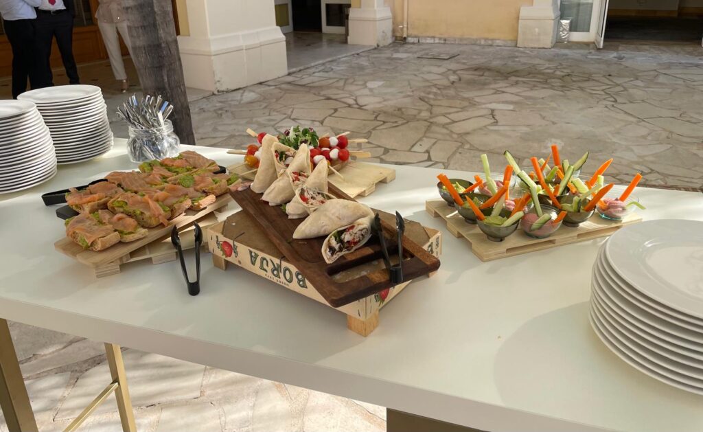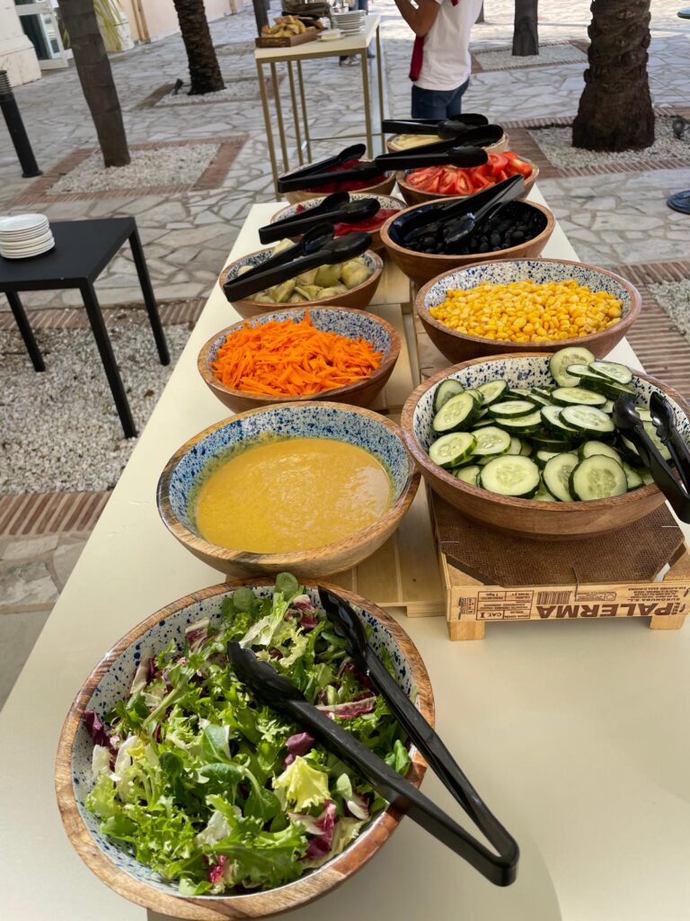 Con esa caricia de aire suave que anticipa el otoño, al aire libre, a la sombra del palmeral que rodea la piscina, el hotel nos obsequió con un aperitivo-comida saludable de ensaladas, tapas, crepes (se escondía el verde en sus capas), tostas de pan de cristal con salmón, bolitas de remolacha con zanahoria, etc. Unos manjares de los que casi nadie se libró de no repetir más de uno.