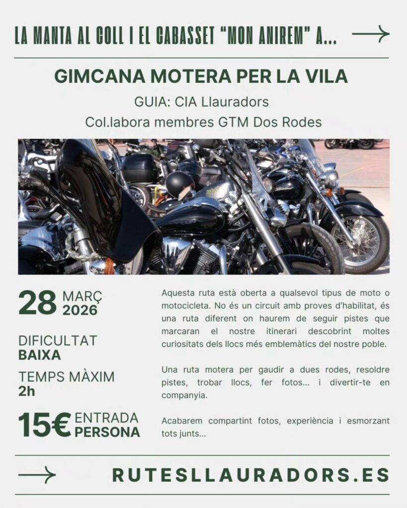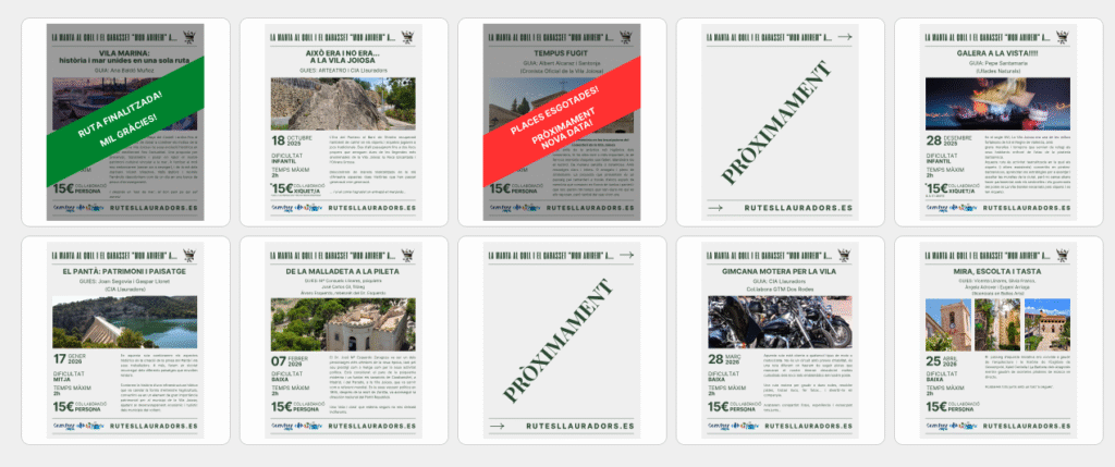 Desde su web oficial rutesllauradors.es , la compañía ha lanzado un programa de rutas patrimoniales que ya se pueden consultar y reservar directamente. Bajo el lema “La manta al coll i el cabasset ‘Mon Anirem a …’” proponen un conjunto de itinerarios agrupados como Rutes 1 a 10, cada uno con su ficha, cartel y formulario, y que se desarrollará desde este mes de octubre hasta abril de 2026.