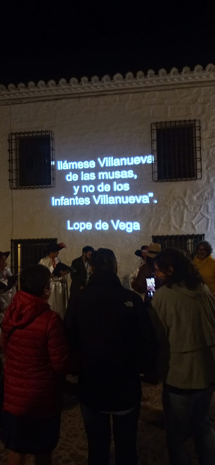 A las 23 horas una ruta nocturna con proyecciones de textos del Quijote y el Infantes del siglo de Oro, que disfrutamos paseando por la luz tenue de las farolas de la noche.
