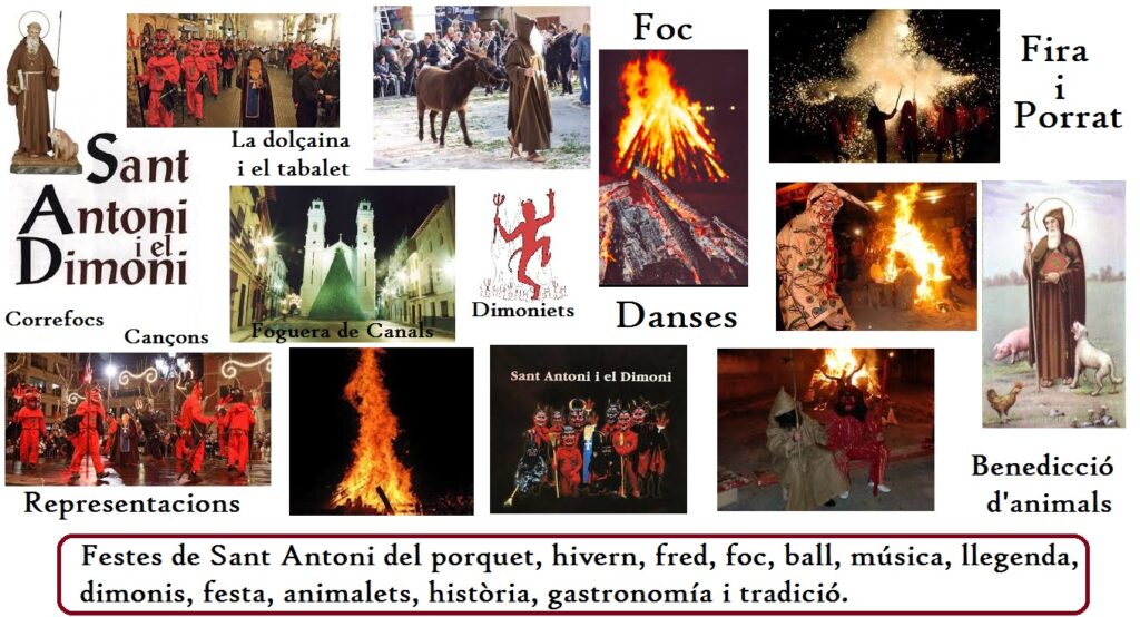 Esta fiesta en la Comunidad Valenciana cuenta con la «bendición de animales» como eje principal junto con la presencia de grandes fuegos y hogueras (destaca la Foguera de Canals, en la Provincia de Valencia, una de las hogueras más grandes del mundo); rodeadas de todo tipo de «dimonis» («les botargues i els diablets o dimoniets») que son el alma de «les Santantonades» (destacan, especialmente en la provincia de Castellón en El Forcall o en Morella, dentro del ciclo de «Les Santantonades de Els Ports«), «correfocs» y similares a ritmo de «dolçaina i tabalet». Sant Antoni del porquet está rodeado siempre de gran tradición, fiesta, fuego y leyendas desde tiempos muy antiguos. Asimismo, esta festividad posee gran número de bailes y danzas, rituales ancestrales, canciones, representaciones, y tradiciones gastronómicas propias de su celebración.