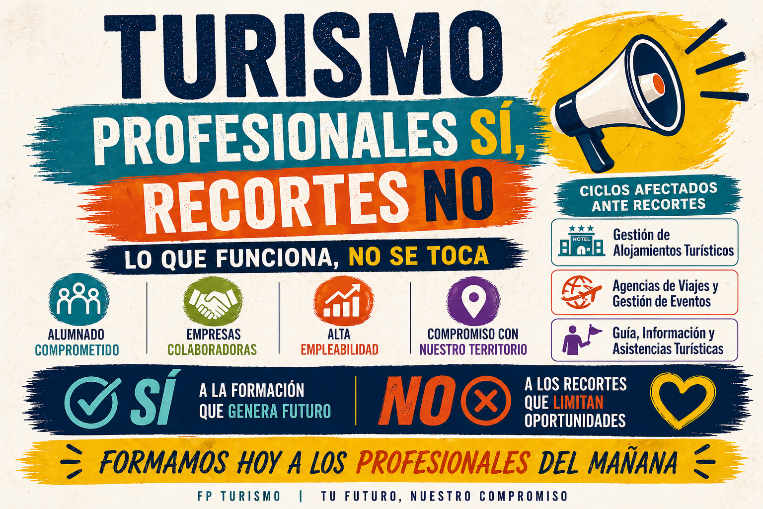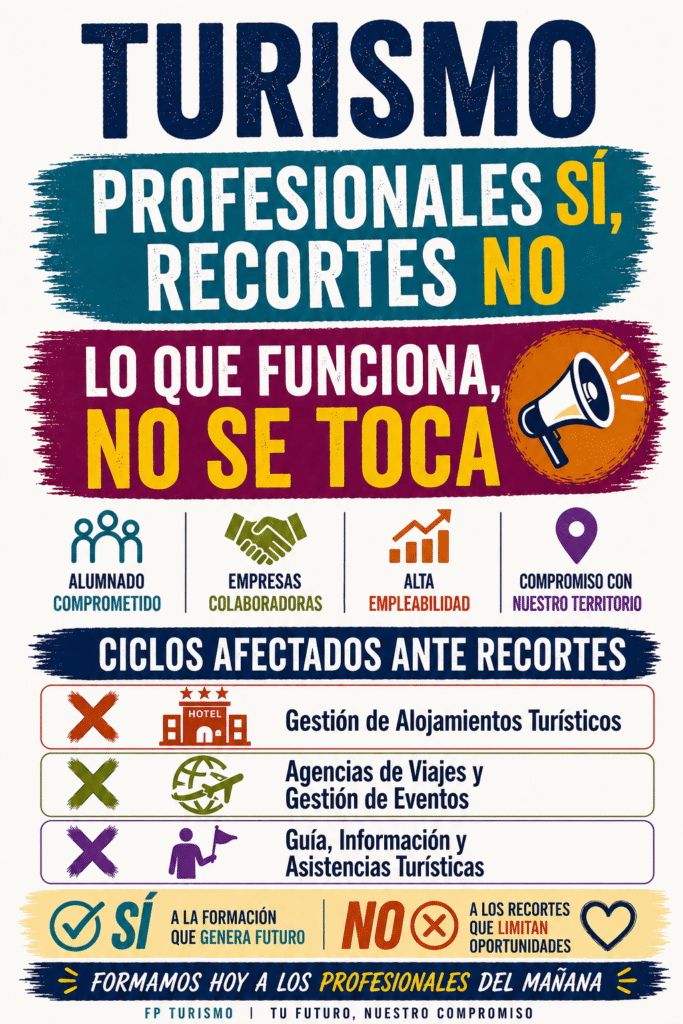 Lo que se está planteando no es un ajuste menor, sino la eliminación de titulaciones directamente vinculadas al tejido productivo: Gestión de Alojamientos Turísticos, Agencias de Viajes y Gestión de Eventos o Guía, Información y Asistencias Turísticas, entre otras. Ciclos con alta demanda, con inserción laboral contrastada y con una conexión directa con las necesidades reales del sector.