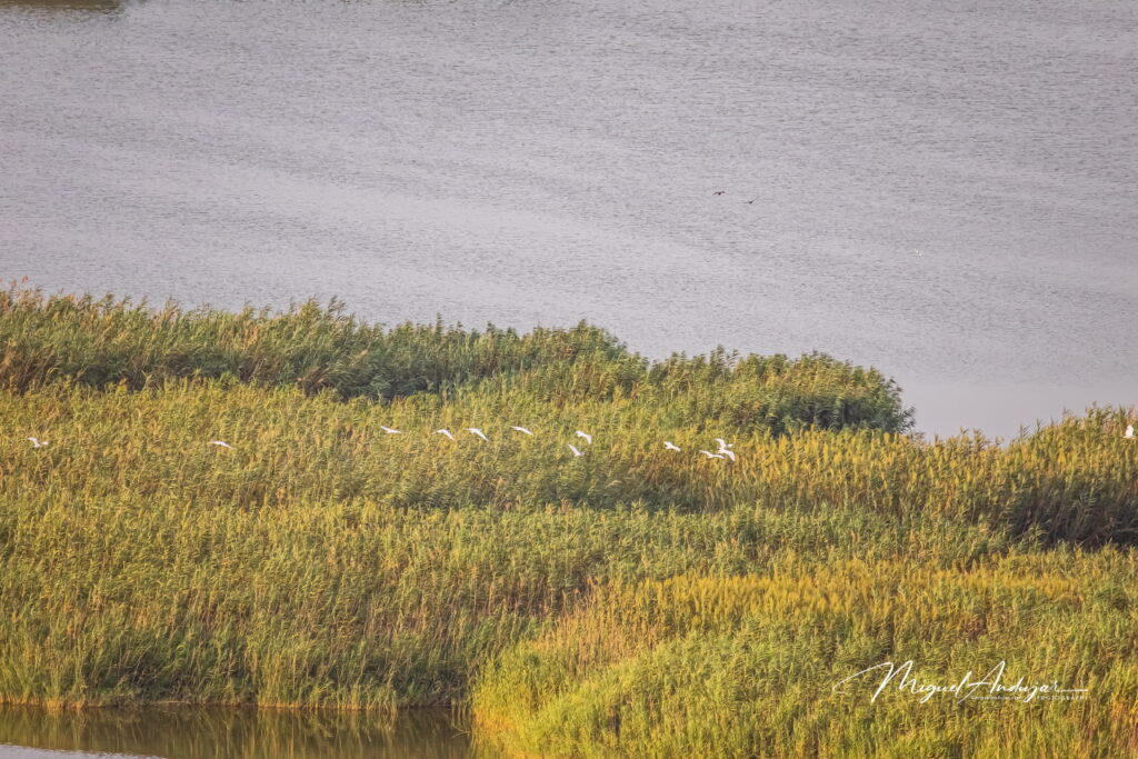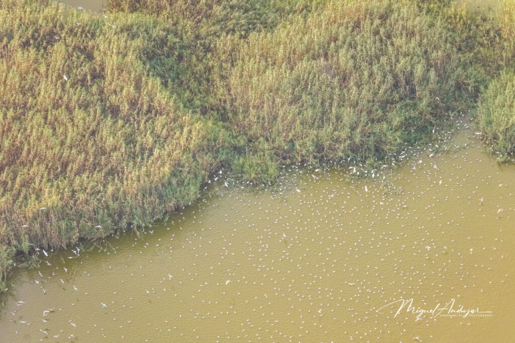 Tras presenciar el atareado proceso de inflado del globo, despegamos desde las inmediaciones de la puerta norte del Parque Natural de El Hondo, una zona húmeda de gran valor ecológico, especialmente conocida por su avifauna y que desde el aire adquiere una dimensión mágica.