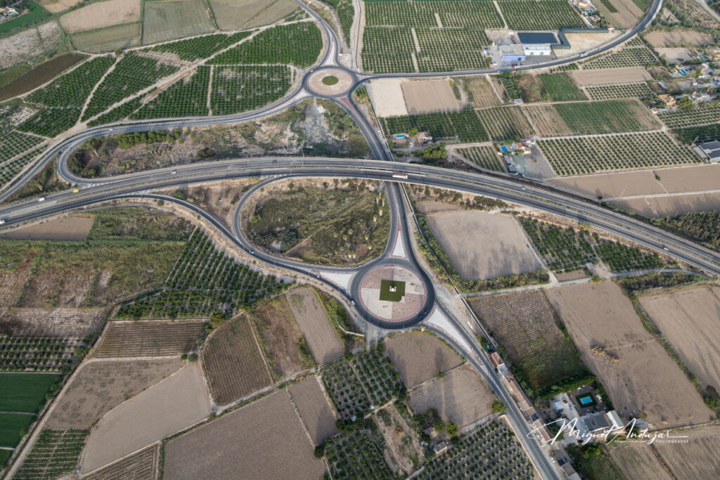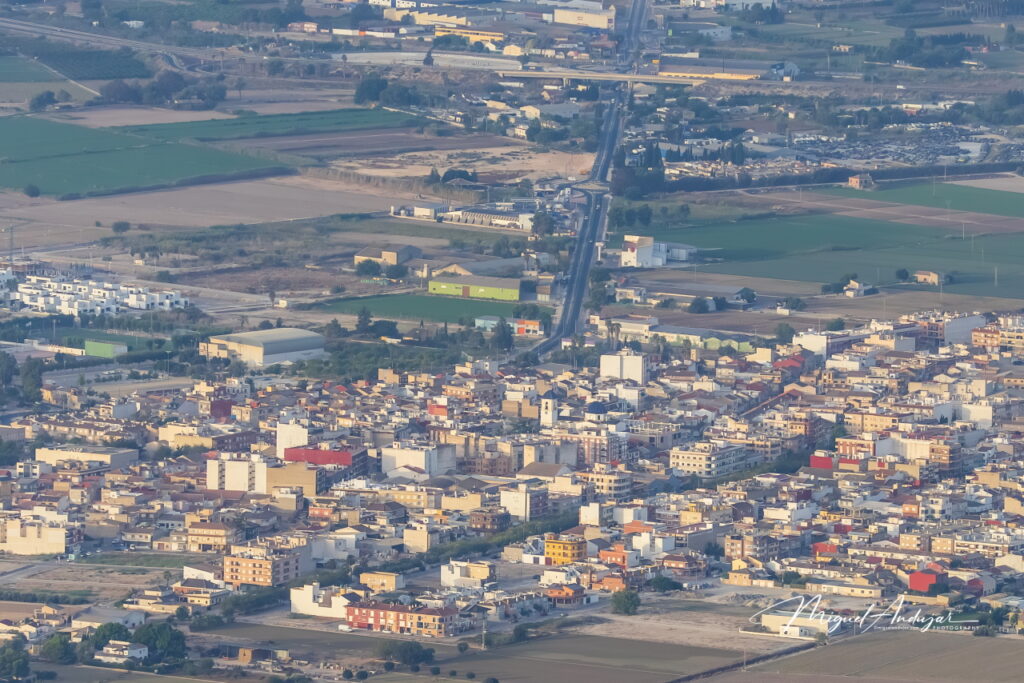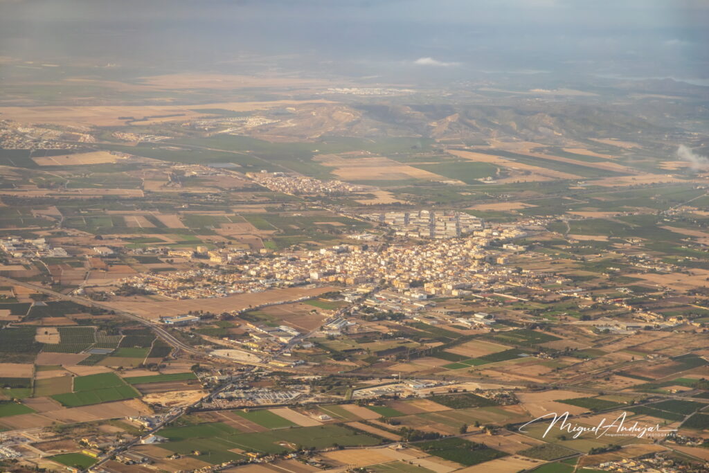 La travesía aérea discurrió con total suavidad. A una altitud máxima de 1.300 metros, sobrevolamos el humedal para no perturbar a las aves, y contemplamos un mosaico de palmerales, cultivos, acequias y poblaciones que se desplegaban bajo nuestros pies. La visión de 360 grados alcanzaba las salinas de Santa Pola, la isla de Tabarca y varios pueblos de la Vega Baja hacia donde nos dirigíamos, como Catral, Dolores, San Isidro, Albatera, Almoradí, Algorfa y Callosa de Segura, con unas vistas espectaculares de su Sierra.