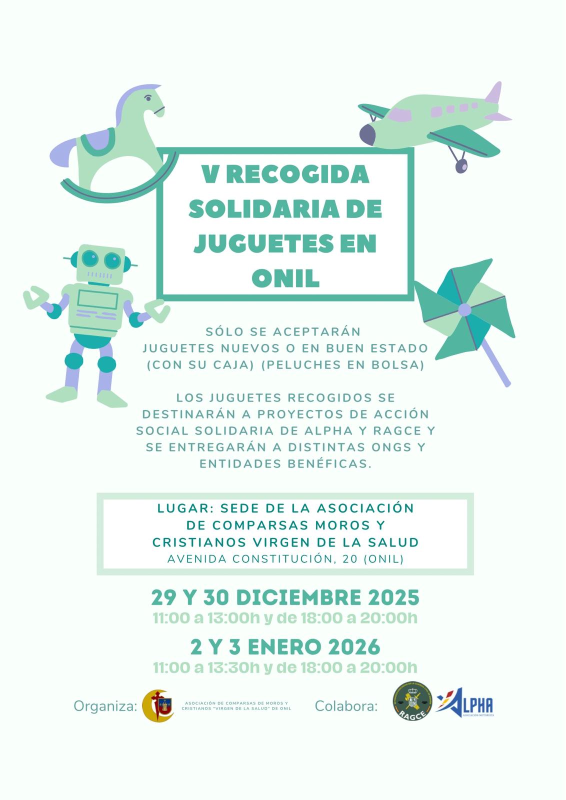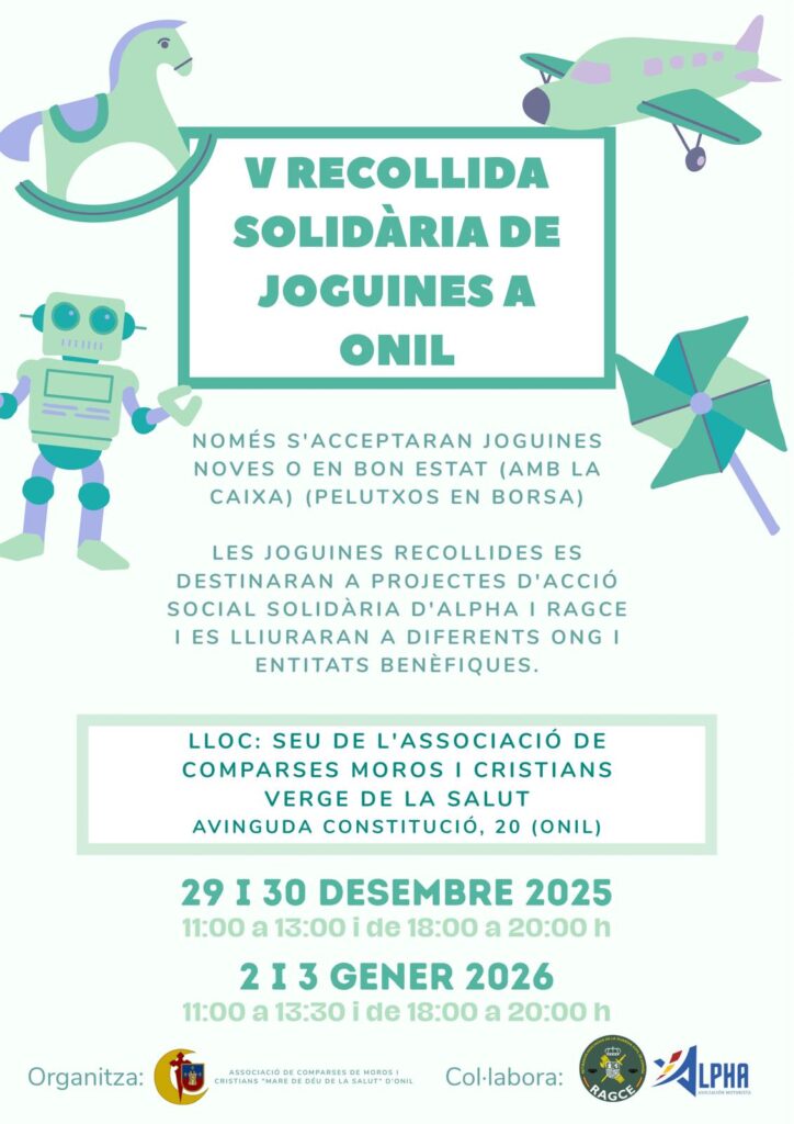 La Asociación de Comparsas de Moros y Cristianos «Virgen de la Salud» de Onil, organiza la 5ª edición de la Recogida Solidaria de Juguetes en Onil (Alicante).