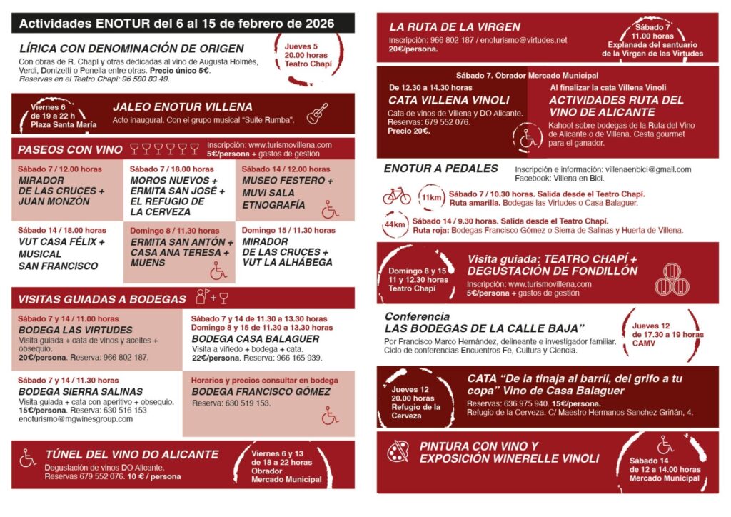 Si te apetece organizar tu escapada y no perderte nada, aquí puedes consultar la programación completa de Enotur Villena con todas las actividades, horarios y reservas: